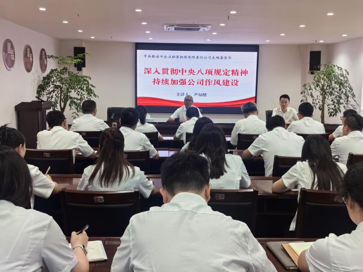 二是黨支部書記講專題黨課。市擔保公司黨支部書記、董事長尹福健以“深入貫徹中央八項規(guī)定精神,持續(xù)加強公司作風建設”為題,為全體黨員、入黨積極分子講授了一堂生動的專題黨課。黨課圍繞充分認識開展學習教育的重大意義、深刻把握中央八項規(guī)定精神的豐富內(nèi)涵和實踐要求、充分認識違反中央八項規(guī)定精神的嚴重性和危害性以及準確把握黨的作風建設的重點任務,自覺強黨性正作風守紀律等4個方面展開,為進一步加強作風建設指明了方向、提供了遵循。